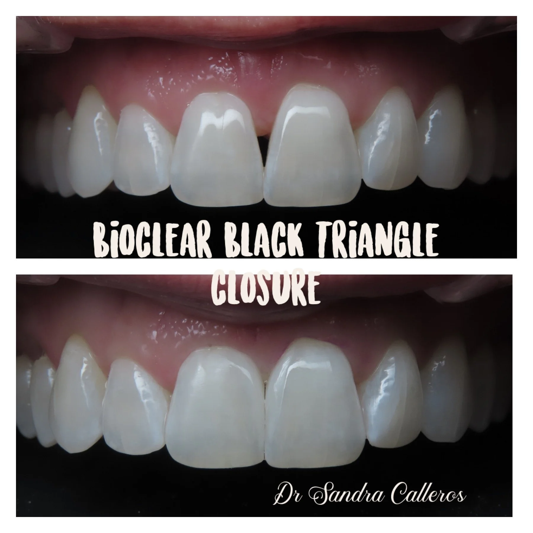 Bioclear is one of the best solutions for black triangles because it gently reshapes the teeth to close the space. The transformation is dramatic: the smile instantly looks fuller, cleaner, and more youthful.